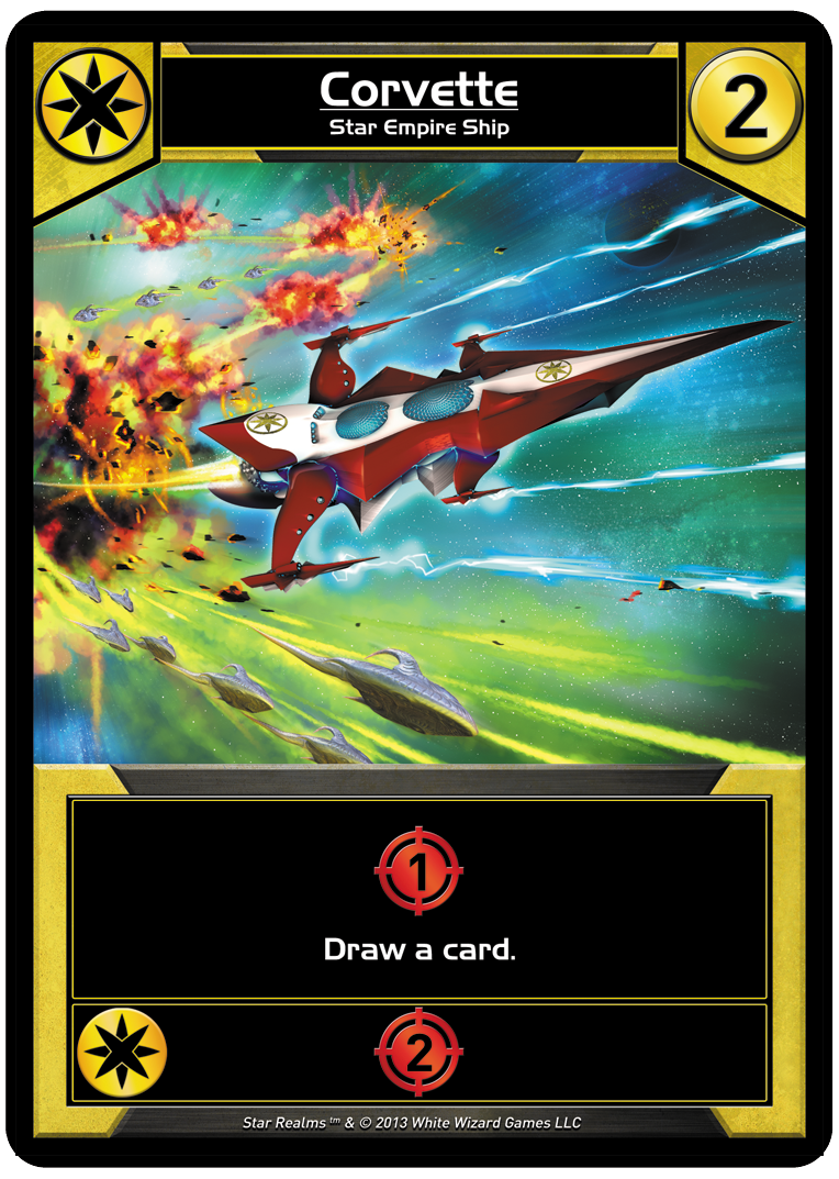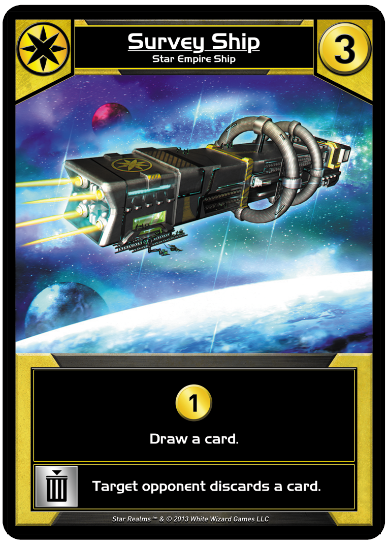 For those of you who aren’t familiar with cantrips (covered in my preview of Battlecruiser), these cards may look somewhat weak. After all, they only add 1 Trade or 1 Combat, which is the same thing your basic Scouts and Vipers already do! However its that “draw a card” clause which makes these cards so much better than expected, giving you that little trade/combat bonus and immediately replacing themselves with a new card in your hand. Though many of the more expensive Star Realms ships have a cantrip built-in, Star Empire is the only faction to feature this kind of low-cost card draw, with the boys in yellow sometimes digging through an extra 2-3 cards each turn! It’s also worth noting that the quicker you draw through your deck, the sooner your new purchases get shuffled in, and Star Empire is great at finding their new toys before any other faction.