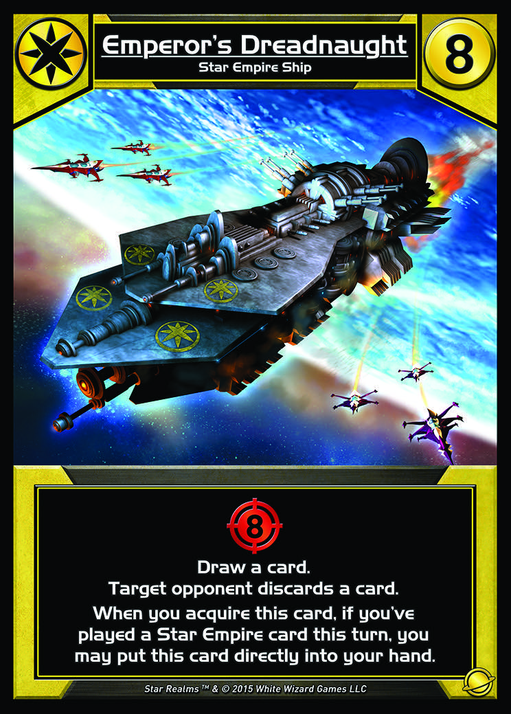 It provides 8 combat, you draw a card, and your opponent discards a card – a real powerhouse yellow ship. Now, it costs 8, so when this thing comes out on the table, you will have a little bit of time before anyone will be able to purchase it. If this comes out early, you are going to have a real reason to buy some yellow cards to get that threat, to be able to buy the Emperor’s Dreadnaught and put it directly into your hand, smashing your opponent right away with it. This card can really really change games if you can pick it up.