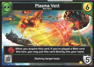 Every faction has cards like this. Green has the Plasma Event. It’s a 6 cost base that does 4 damage every turn. A really hard-hitting base, it smashes for 4 combat every single turn. Being able to buy this directly off the board, putting a permanent threat on the table for you, and it will really help you clear your opponent’s bases off the table the turn you purchased it, if you’ve played a green card that turn.